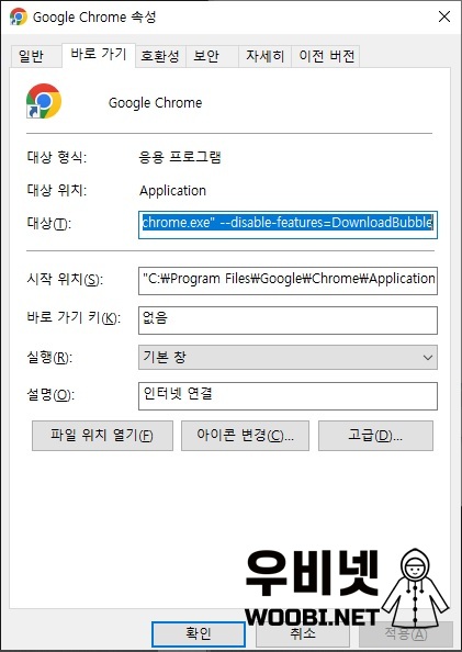 예) 대상(T): "C:\Program Files\Google\Chrome\Application\chrome.exe" --disable-features=DownloadBubble