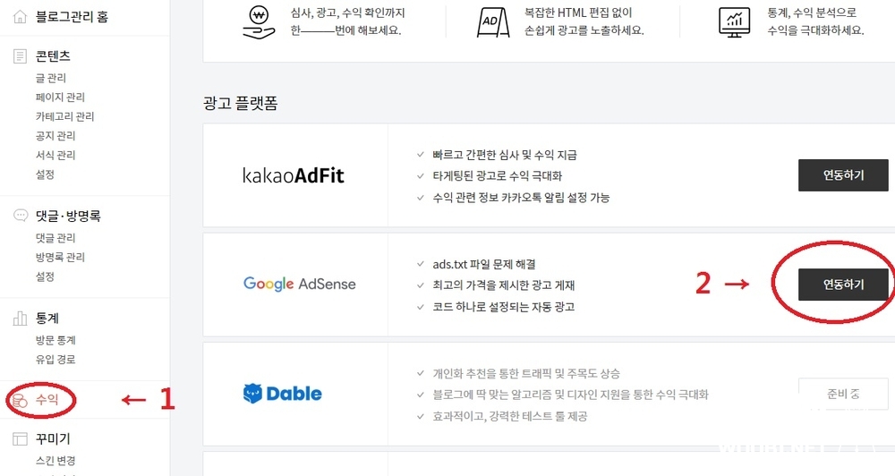 1. 티스토리 로그인 → 관리 → 수익 → Google Adsense 연동하기