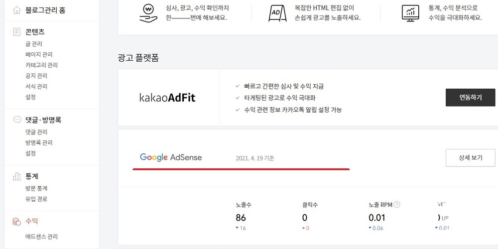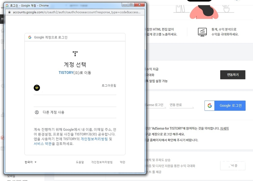 1. 티스토리 로그인 → 관리 → 수익 → Google Adsense 연동하기