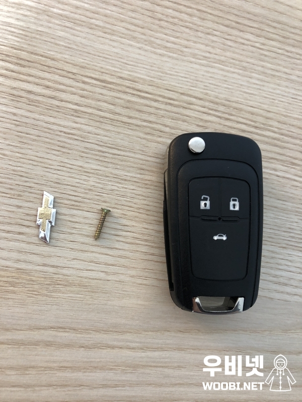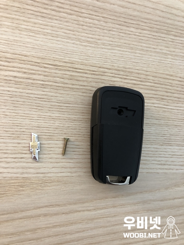내용물은 플라스틱케이스, 나사, 쉐보레 마크 3가지이다.