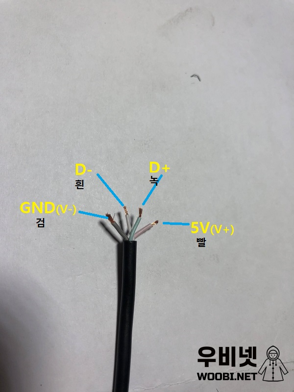 단자 부분을 보면 5V, D-, D+, GND라고 씌어 있다.